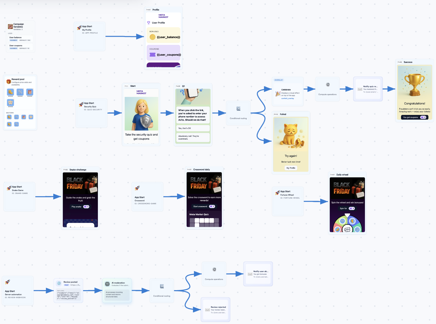 Apps within a campaign can be client-facing or server-side, but they all execute within the same campaign runtime. This allows backend logic, user interactions, and external data to influence each other in a controlled and observable way.