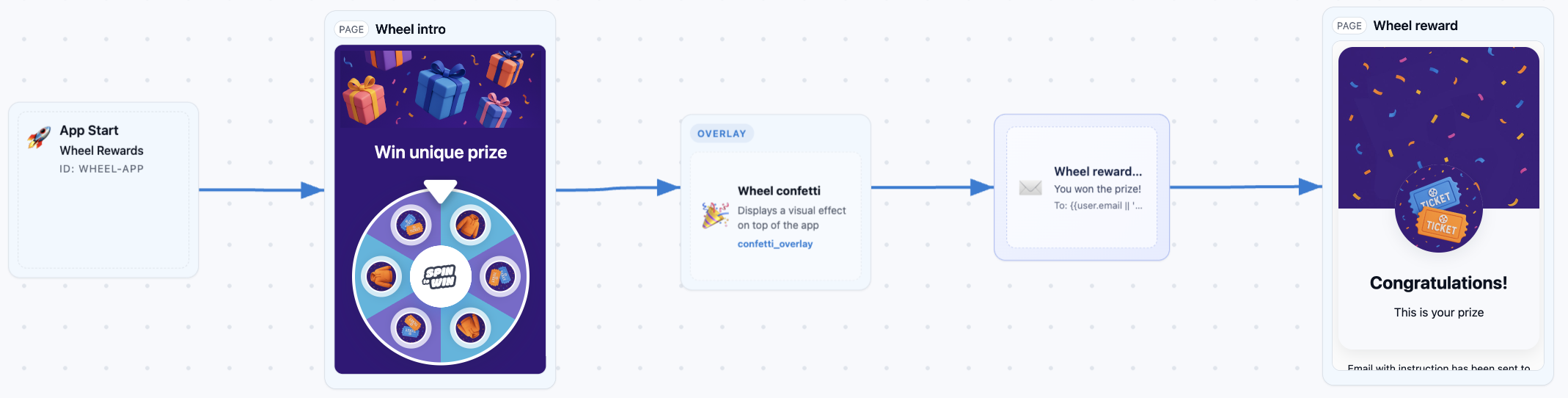 When this marketing mini-app loads, the user sees several UI components with a fortune wheel as the primary focus. The flow waits for the user to spin the wheel before advancing. After the spin completes, the experience displays a confetti layer, triggers an automated email, and then shows a final congratulations screen before ending.